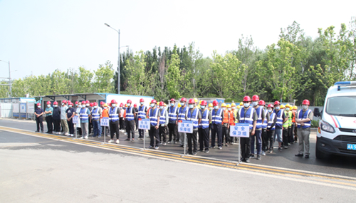 本次演練以因強降雨造成滹沱河和太平河洪水爆發(fā),即將對項目部造成威脅為背景,模擬項目部員工發(fā)現(xiàn)險情后,立刻向項目部防汛值班領(lǐng)導(dǎo)報告,值班領(lǐng)導(dǎo)向指揮長進行報告,指揮長下令立刻啟動應(yīng)急預(yù)案,各應(yīng)急小組迅速進入應(yīng)急備戰(zhàn)狀態(tài),配備防汛機具,迅速奔赴現(xiàn)場搶險,設(shè)置警示標(biāo)志和安全警戒區(qū)域,組織人員疏散,搶救重要物資,加固土坡,裝運沙袋,同時組織修復(fù)道路,恢復(fù)交通,保證撤離路線暢通,進行搶險救援全過程。