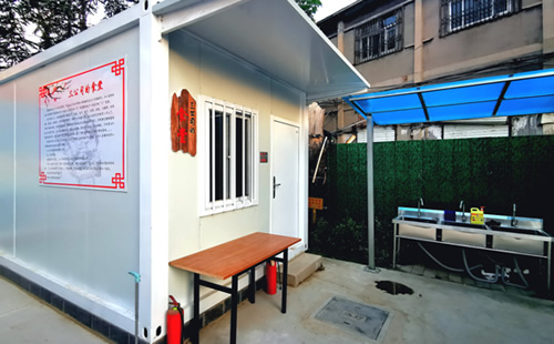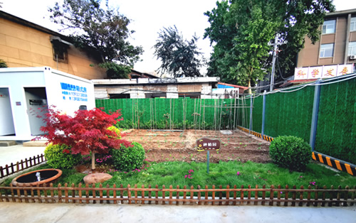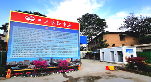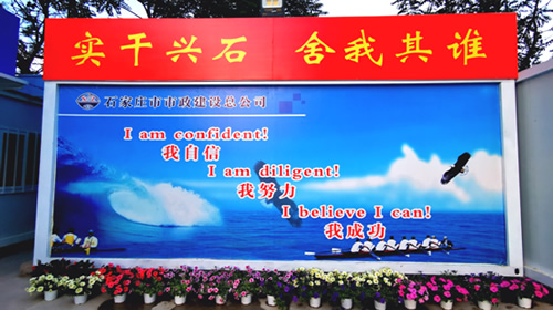 中央商務區(qū)正太廣場項目部,根據(jù)現(xiàn)場實際情況及廣場圖紙,因地制宜,利用原地道橋位置進行簡約化設計,占地東西長40米,南北寬20米。麻雀雖小五臟俱全,項目布局充分利用移動板房外立面做文化設計,用作公司簡介宣傳墻、食堂文化宣傳墻及旗桿背景墻。項目部除辦公區(qū)外,還設置了餐廳、獨立衛(wèi)生間、淋浴間等生活設施以及微景觀種植園等休閑場所,整個項目部簡約而不簡單,注重以人為本,盡可能提高項目部人員工作、生活水平,激發(fā)了干部職工干事創(chuàng)業(yè)的激情,為推進項目建設提供了有力支撐。